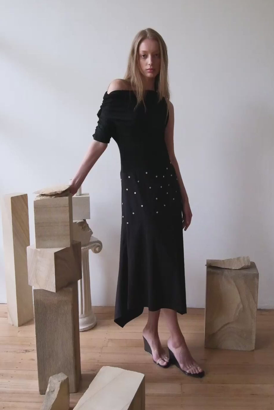 INTRO | An asymmetric dress with a soft, draped neckline and an angled contrast panel that cuts cleanly through the waist. The skirt falls with gentle movement, while the black version features small contrast buttons that create a polka-dot effect.